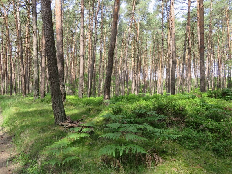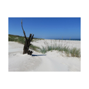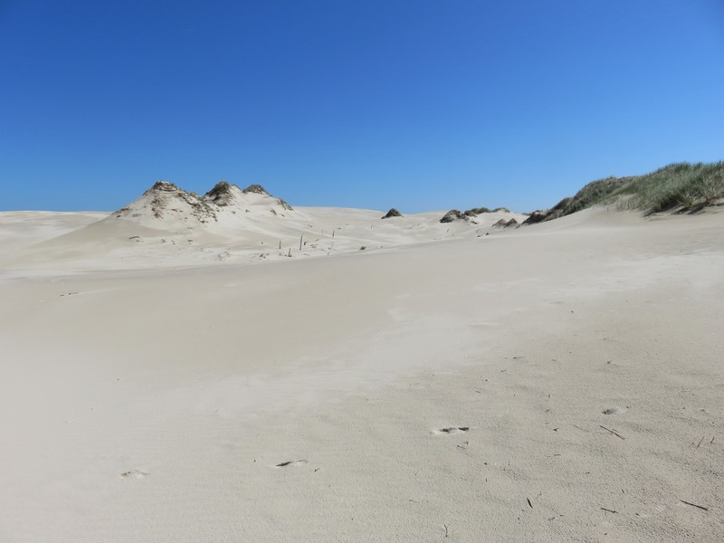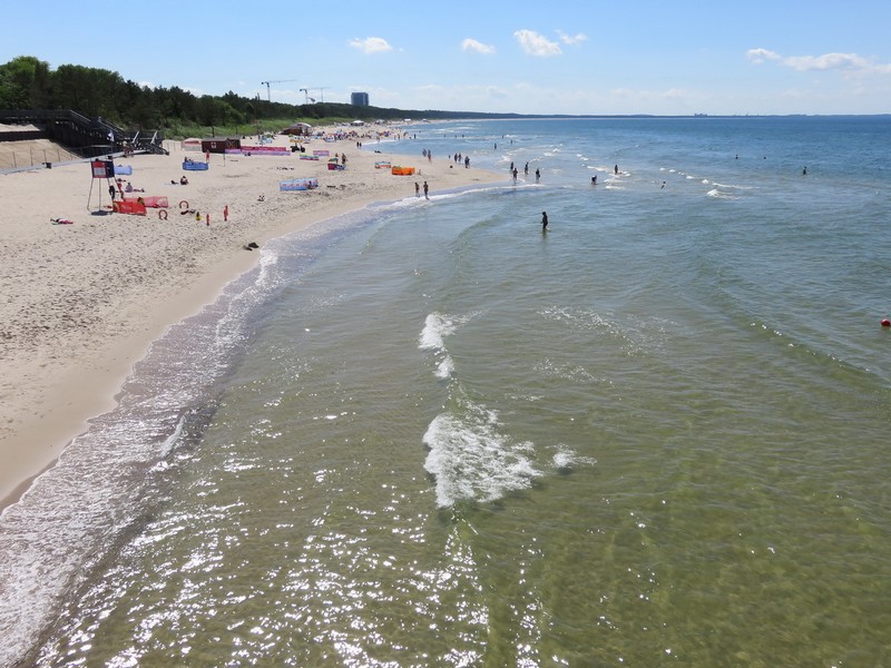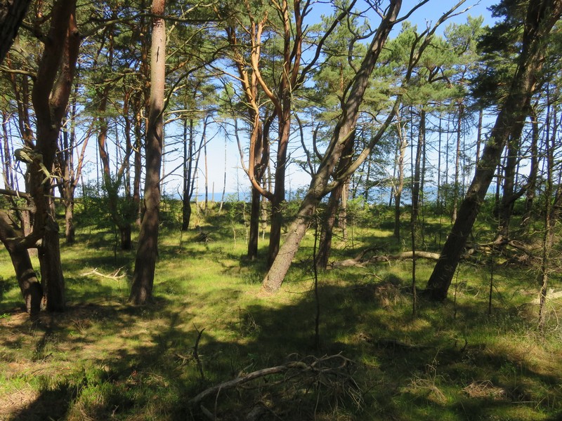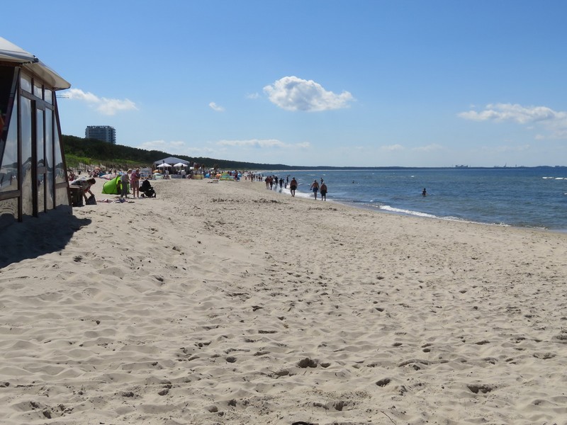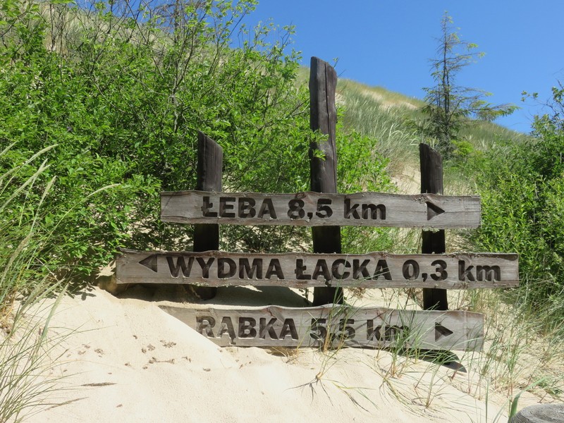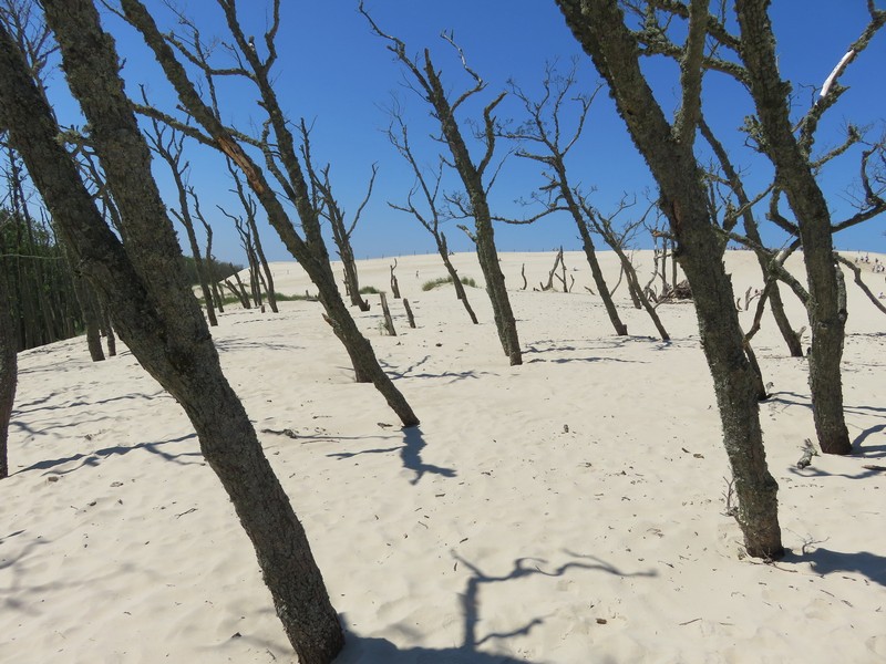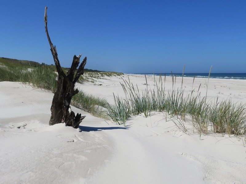 Von Leba aus unternehmen wir eine Tour in den Slowinzischen Nationalpark. Mit dem Velo radeln wir durch einen wunderbaren, naturbelassenen Föhrenwald bis wir nicht mehr weiterkommen und im Sand stecken bleiben. Jetzt sind wir am Fuss der Lącka Góra Düne. Der Aufstieg auf den 50 Meter hohen Sandhügel ist recht anstrengend. Oben werden wir aber mit einem fantastischen Ausblick belohnt. Weisse Sandberge, soweit das Auge reicht. Wir wandern über diese grossartige Dünenlandschaft und geniessen den Ausblick auf den Lebsko See und auf die Ostsee. Wir wandern hinunter bis ans Meer, kehren aber wieder über die Düne zurück. Auf dem Rückweg kommen wir durch einen abgestorbenen Wald. Nicht zuletzt auch wegen der Hitze erinnert uns diese Landschaft an das Dead Vlei in Namibia.