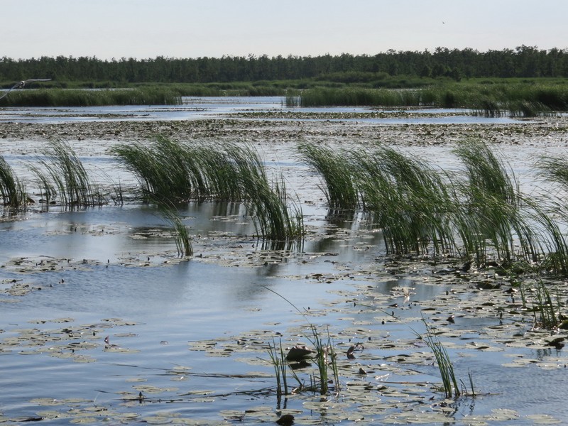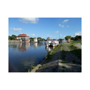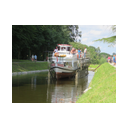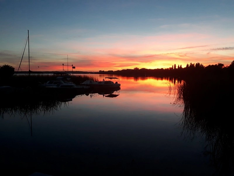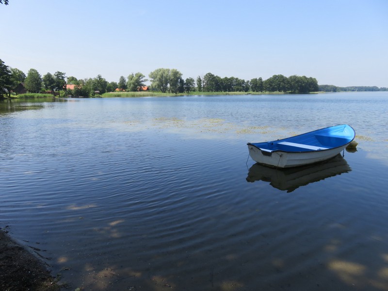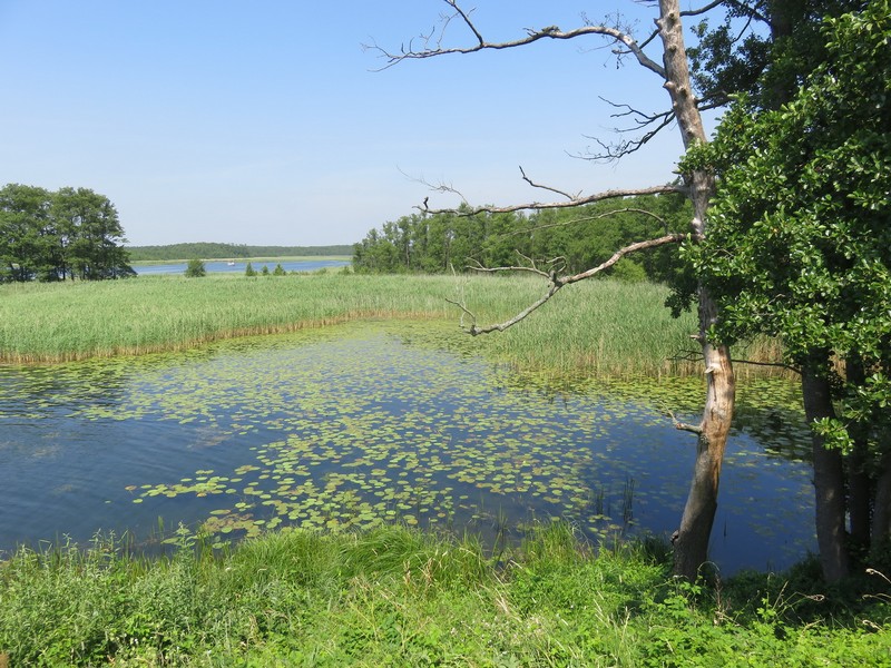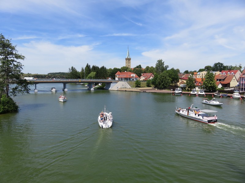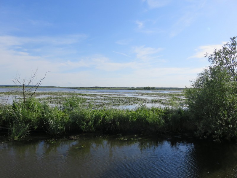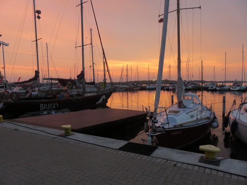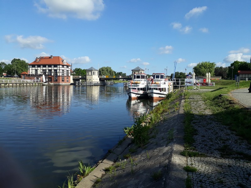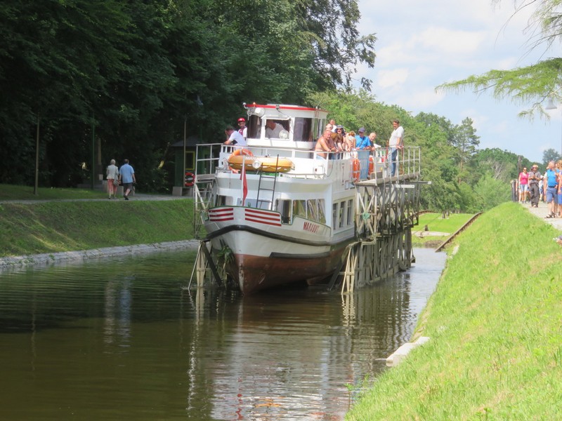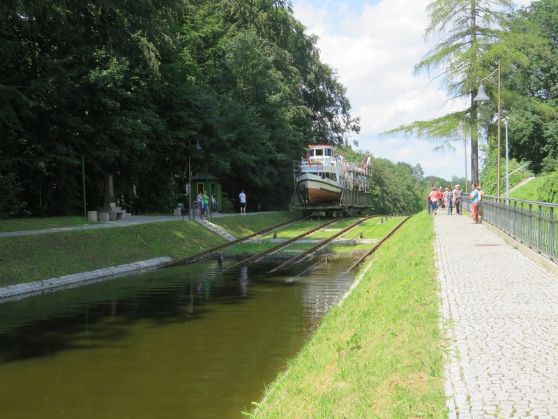 Ein Taxi bringt uns zur Schiffanlegestelle nach Buczyniec. Bald können wir einsteigen und unser Schiff wird auf einen Wagen aufgebockt und auf Schienen über die erste Gleitbahn hinuntergelassen. Das funktioniert ähnlich wie bei unseren Standseilbahnen. Die Drahtseile werden hier mit grossen Wasserrädern angetrieben. So fährt unser Schiff einfach im Trockenen über eine Wiese. Diese Anlage ist einmalig in Europa und wird nicht umsonst als technisches Denkmal der Wasserbaukunst bezeichnet. Wir passieren fünf solche geneigten Ebenen. So überwinden wir insgesamt 90 Höhenmeter. Das Interesse vom Aufbocken und Abseilen nimmt allerdings von Anlage zu Anlage ab. Dafür geniessen wir die schöne Landschaft. Der Kanal mündet bald in einen See. Das verändert die Landschaft und wir werden wieder etwas aufgeweckt. Dieser See hat viele Seerosenfelder und schöne Schilfbänke, wo unzählige Möwen, Enten und Blesshühner nisten. Weil es jetzt schon 18 Uhr ist, strahlt alles in einem schönen Abendlicht.