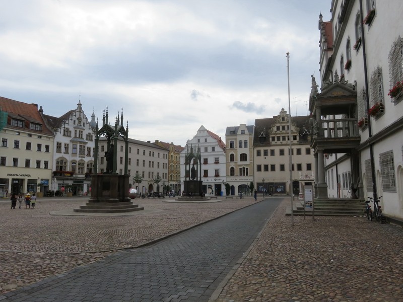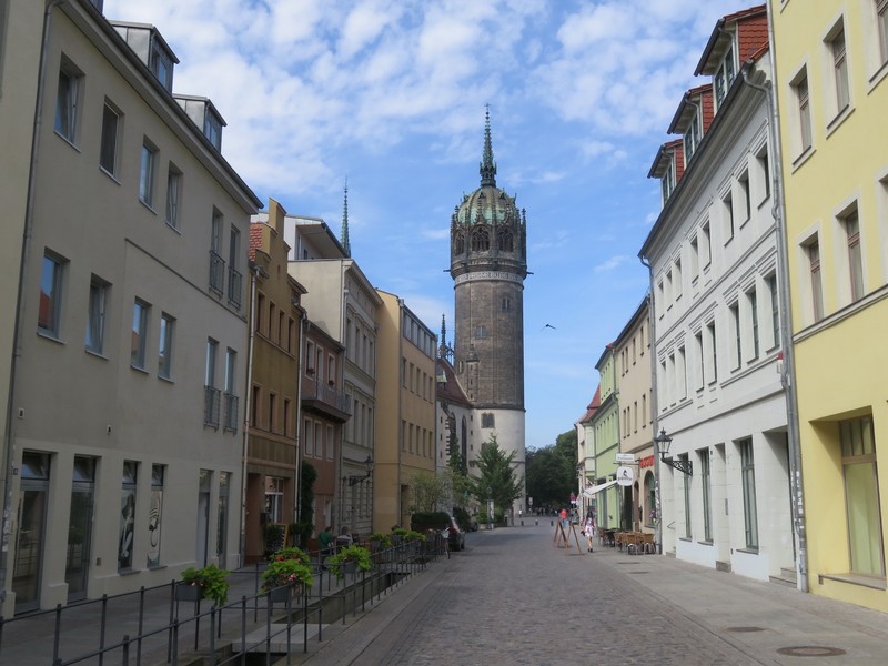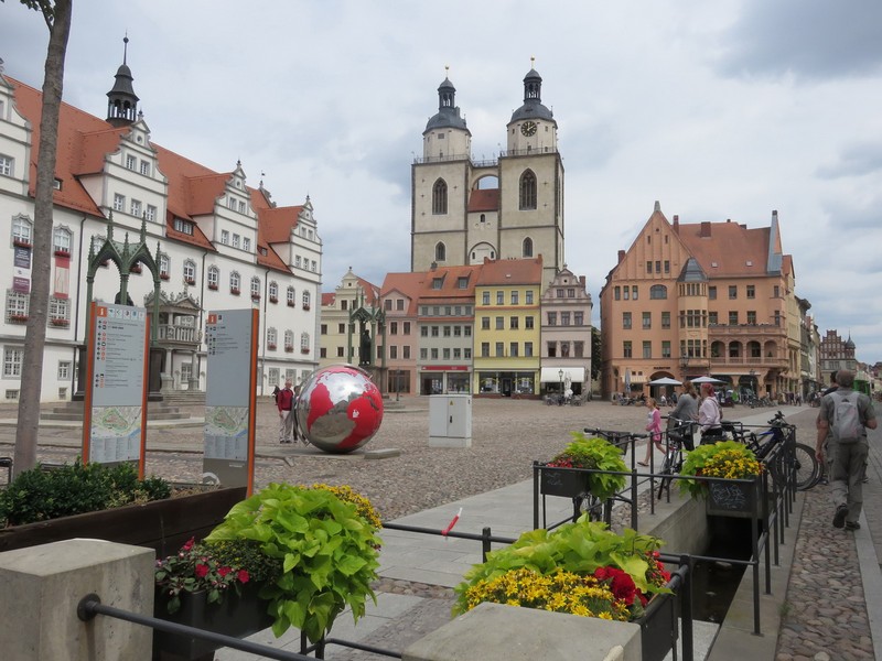 Wir entschliessen uns zwei Tage in der Lutherstadt Wittenberg zu bleiben. So Haben wir genügend Zeit um auch das Asisi-Panorama «Luther 1517» zu besuchen. Von einem Podest aus können wir das ganze 75 Meter lange und 15 Meter hohe Bild überblicken. Es zeigt Wittenberg zur Zeit als Martin Luther seine 95 Thesen veröffentlichte. Per Audioguide werden uns die einzelnen Bildausschnitte erklärt und wir bekommen einen guten Einblick in das Leben vor 500 Jahren. Die einzelnen Szenen werden abwechslungsweise beleuchtet und hervorgehoben. Es werden auch die Tageszeiten vom Erwachen des Tages, bis zur Nacht simuliert. Wir schauen lange und sind ganz fasziniert von dieser grossartigen Show.