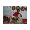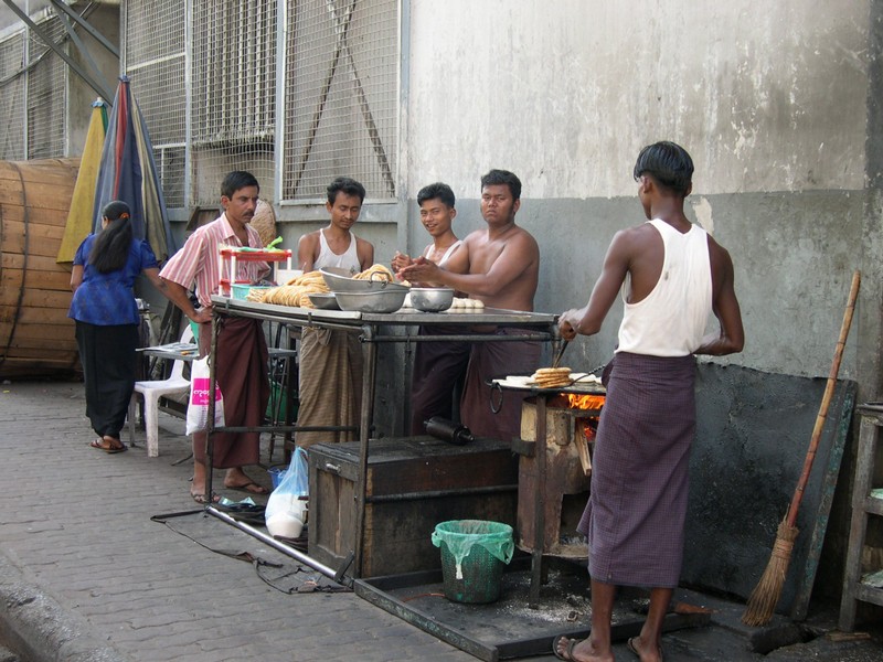 Während unserm Aufenthalt in Mandalay haben wir ein Straßen Restaurant zu unserer Stammbeiz erkoren. Einfache Plastikmöbel werden von einer Zeltplane beschattet. Das Lokal wird von einer Familie geführt geführt. Ohn-Mar, die Tochter kann gut Englisch, weil sie tagsüber studiert. Abends arbeitet sie jeweils im Restaurant. Sie interessiert sich sehr für uns und unser Land. Sie erzählt uns auch viel über das Leben in Burma. Der Vater schmeisst die Beiz tagsüber und die Grossmutter sitzt den ganzen Tag auf dem Plastikstuhl, raucht burmesische Cherohnots und schaut stumm dem Geschehen zu. Das ist alles sehr interessant und wir fühlen uns herzlich aufgenommen. Wir gehören schon fast zur Familie. Ohn-Mar will uns den Nachtmarkt zeigen. Mit einer Rikscha lassen wir uns in ein Restaurant in der Nähe des Marktes fahren. Das Velo hat kein Licht dafür eine grosse laute Glocke mit welcher der Fahrer über die Kreuzungen laut schellt! Wir wundern uns, dass die vielen Velos, Autos, Töffs und Rikschas so gut an einander vorbeikommen. Bei Ohn-Mar im Beizli trinken wir am letzten Abend noch einen Schlummer-Rum. Zum Abschied beschenkt sie uns alle mit einem goldenen, glücksbringenden, winkenden Büsi. Wir sind sehr gerührt über diese Geste. Die Leute haben ja selber nicht viel und jetzt beschenken sie uns noch. Sehr beeindruckt von dieser Gastfreundschaft kehren wir in unser, nicht nur wegen der Klimaanlage, kühles Hotel zurück.