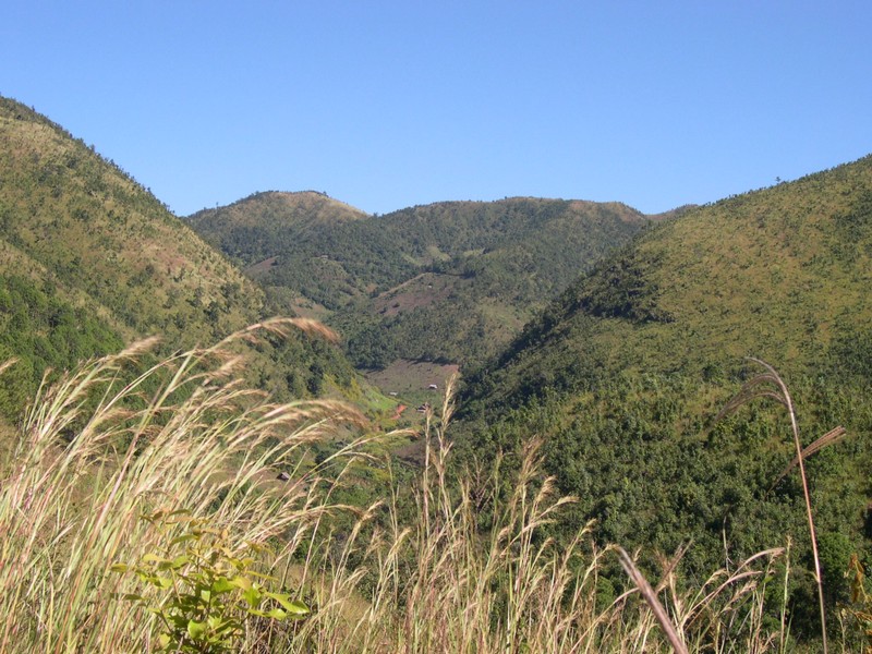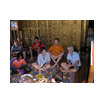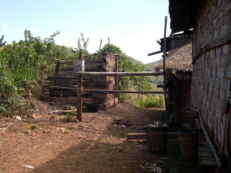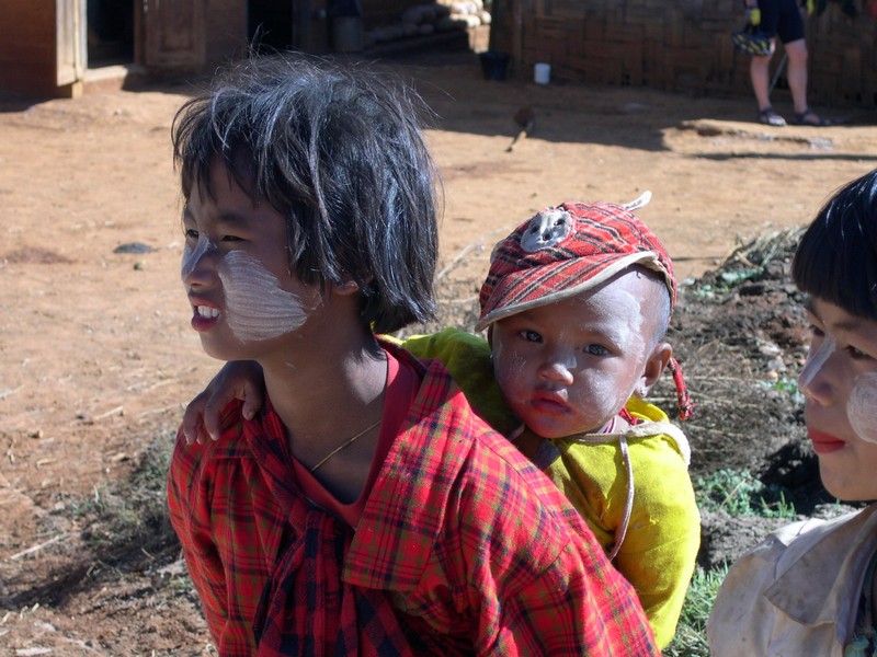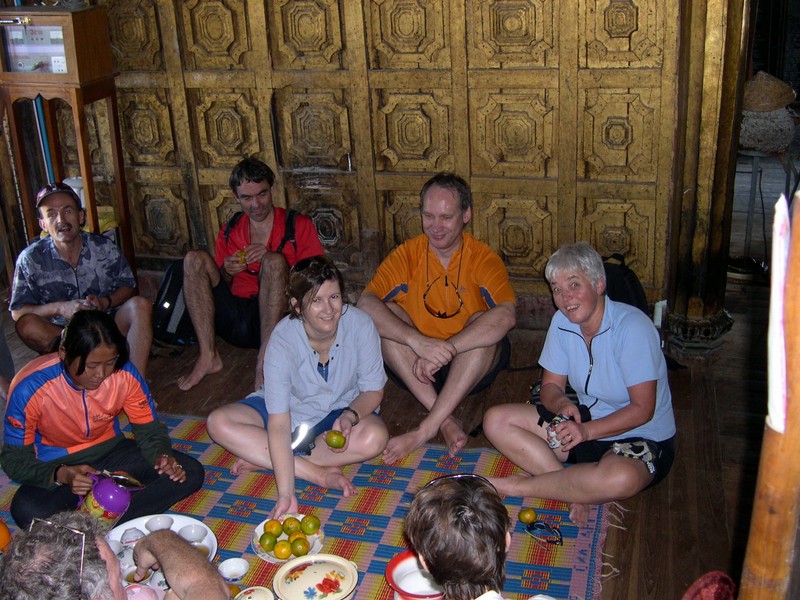 In einem kleinen abgelegenen Dorf sitzen die Frauen vor dem Haus. Wir möchten sie fotografieren, aber die Frauen winken ab. Zuerst kommen die Kinder angerannt und wir geben ihnen Seifen und Shampoo, welches wir im Hotel mitgenommen haben. Die Männer interessieren sich für unsere Bikes. Ich lasse einen Mann mit meinem Velo fahren. Er fährt sehr unsicher, und schwankt hin und her, bis er im Wald verschwindet. Als er endlich wieder zurück kommt meint gestenreich, mein Velo sei nicht in Ordnung, der Rücktritt sei kaputt. Die Kinder haben mittlerweile die Seife den Müttern gezeigt und Kyu Kyu unsere Reiseleiterin hat auf burmesisch erklärt woher wir kommen. Am Schluss dürfen wir fotografieren und sogar das Innere des typischen, einfachen Bauernhauses besichtigen.