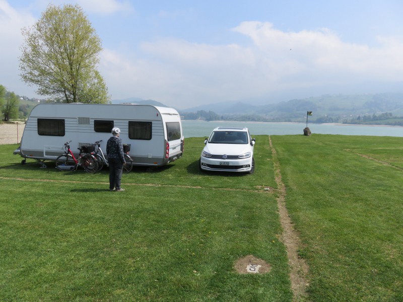 Auf dem Campingplatz am Lac de la Gruyère treffen wir auf unsere Scherenschneider-Freunde, welche mit ihrem Campingbüsli unterwegs sind. Sie besuchen mit uns die Vernissage in Bulle. Als wir zurück kommen sind Tisch und Stühle von unseren Freunden verschwunden. Sie sind auf dem Platz bei den jungen Zeltnachbarn in Gebrauch und müssen zurückgefordert werden.