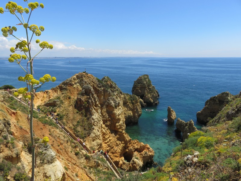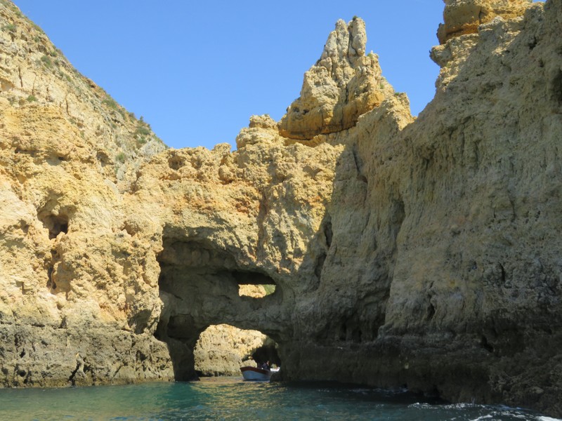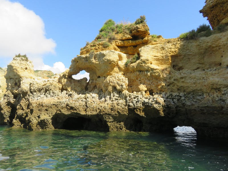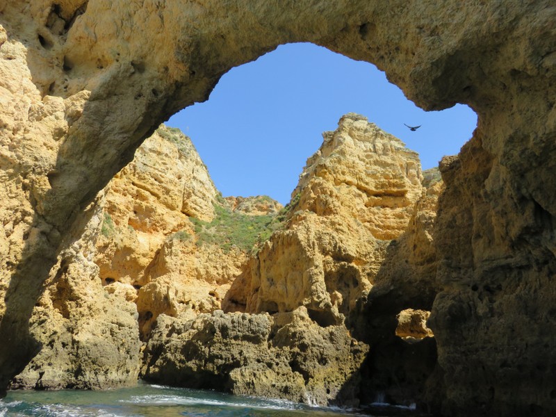 Beim Ponta da Piedale bei Lagos ist gemäss unserem Reiseführer der schönste Küstenabschnitt der Algarve. Wir besichtigen diesen vom Meer aus, nur zu fünft in einem kleinen Boot. Der Kapitän fährt mit uns der verwinkelten Steilküste entlang. Hier gibt es viele schöne Grotten und Felsbögen, welche wir um- und unterfahren. An den schönsten Stellen fahren wir ganz langsam und haben genug Zeit zum Staunen und zum Fotografieren. Überall nisten Möwen und sogar Seeadler flattern über unsere Köpfe hinweg. Das warme Morgenlicht wirft wunderbare Schatten auf die verschiedenen Felsformationen, wie das Kamel, die Titanic und wie sie alle heissen. Diese Fahrt ist traumhaft und bei diesem herrlichen Wetter ein grosses Erlebnis. Nur schon wegen dieser Bootsfahrt hat sich unsere weite Reise gelohnt.