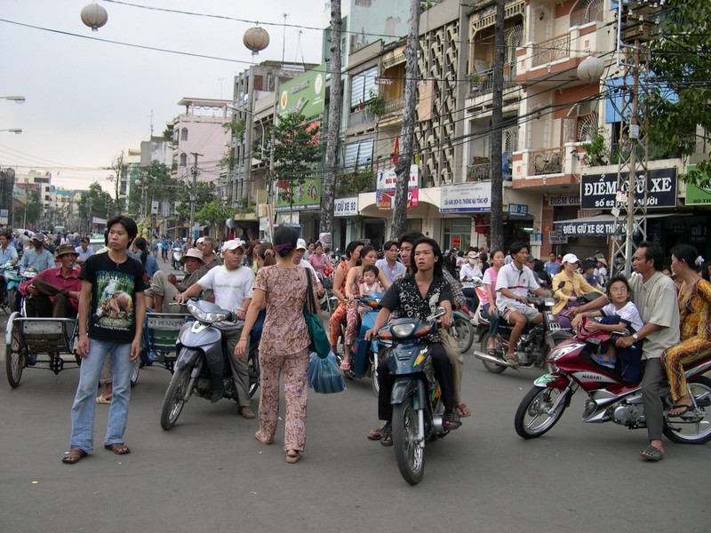 In Saigon gibt es nur 100'000 Autos aber 2,7 Millionen Roller. Ich habe das Gefühl heute seien all diese auf der Strasse. Wo man hinschaut fahren Mopeds, welche nicht selten mit drei bis vier Personen besetzt sind. Der Verkehr mit dem Durcheinander von Fussgängern, Velos, Rikschas und Autos und eben diesen Rollern sieht sehr chaotisch aus, aber er funktioniert. Auf dem Rückweg vom Hafen zum Hotel müssen wir eine ca. 10 m breite Strasse überqueren. Das erscheint uns unmöglich, denn in beiden Richtungen fliesst eine breite und nie endende Kolonne mit unzähligen Mopeds, fünf oder gar zehn nebeneinander. Fussgängerstreifen oder Lichtsignale suchen wir vergebens. Hai erklärt uns wie man in Ho Chi Minh City eine Strasse überqueren muss: „Du musst nur ganz langsam laufen. Die Rollerfahrer sehen dich schon und weichen aus. Nur eines darfst du nicht, du darfst auf keinen Fall stehen bleiben sonst bist du verloren“. So werfen wir uns mutig in den Töffverkehr, setzen einen Fuss vor den anderen und siehe da es geht! Die Rollerfahrer weichen nach links und rechts aus und wir erreichen sicher und glücklich die andere Strassenseite. Auf den Strassen ist noch so viel los heute Abend, sodass wir trotz der aufkommenden Müdigkeit noch nicht ins Bett wollen. Wir schlendern weiter durch die grosse Stadt und sind schon fast süchtig nach Strassenüberquerungen.