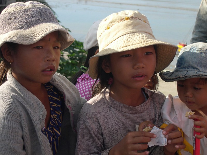 Auf dem Rückweg verhandeln Hai und Karl mit einem Fischer, ob wir einmal ein solches Korbboot ausprobieren dürften. Alleine dürfen wir nicht aber der Fischer macht mit uns eine kleine Rundfahrt. Bei einem vietnamesischen Kaffee, schenken wir den Kindern welche uns umringen unsere überzähligen Riegel. Als Dank schenken sie uns aus Lotterielosen gefaltete Papierschiffchen. Diese bekommen einen Ehrenplatz in meiner Schifflisammlung.
