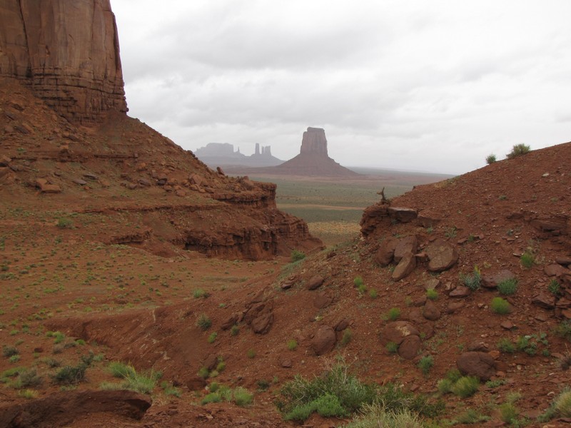 Dass wir bei einem der seltenen Regen im Monument Valley dabei sein dürfen, ist für uns ein Highlight. Vermutlich hat es gestern schon geregnet und wir können erleben, wie die Wüste grünt. Die hier nur spärlich vorhandenen Pflanzen blühen in den schönsten Rot- Gelb- und Blautönen. Das Rot der Steine und Felsformationen wirkt noch intensiver als sonst. Alles ist frisch gewaschen und herausgeputzt. Die Rückfahrt mit dem Jeep auf den schlammigen Strassen ist manchmal sehr abenteuerlich. Wir werden zwar im offenen Fahrzeug ein bisschen nass, aber bei trockenem Wetter wären wir vermutlich sehr staubig geworden.